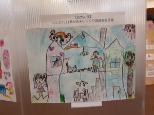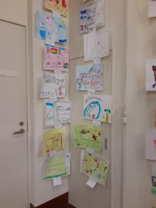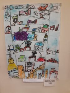 今回は、交通安全の絵と住みたい家を書きました。他にも、家族の絵や大好きな人の絵を描きました。