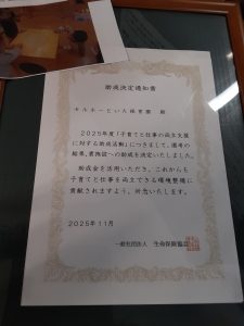 贈呈式が行われ、協会の皆さんと意見交換を行うことが出来ました。これからの子育てのこと、少子化のことも話が出来ました。大事に使わせていただきます。