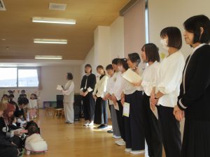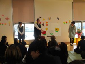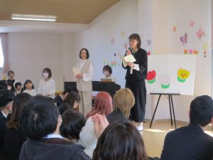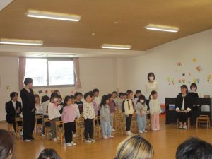 年長組さんが「春が来たんだ」と「ちゅうりっぷ」の歌で歓迎しました。